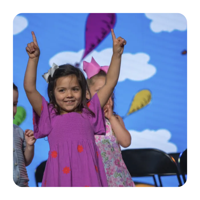 Children begin exploring colors, shapes, counting, and social skills. Music, movement, and art projects support motor and creative development, while sign language and Bible stories introduce faith and communication skills.